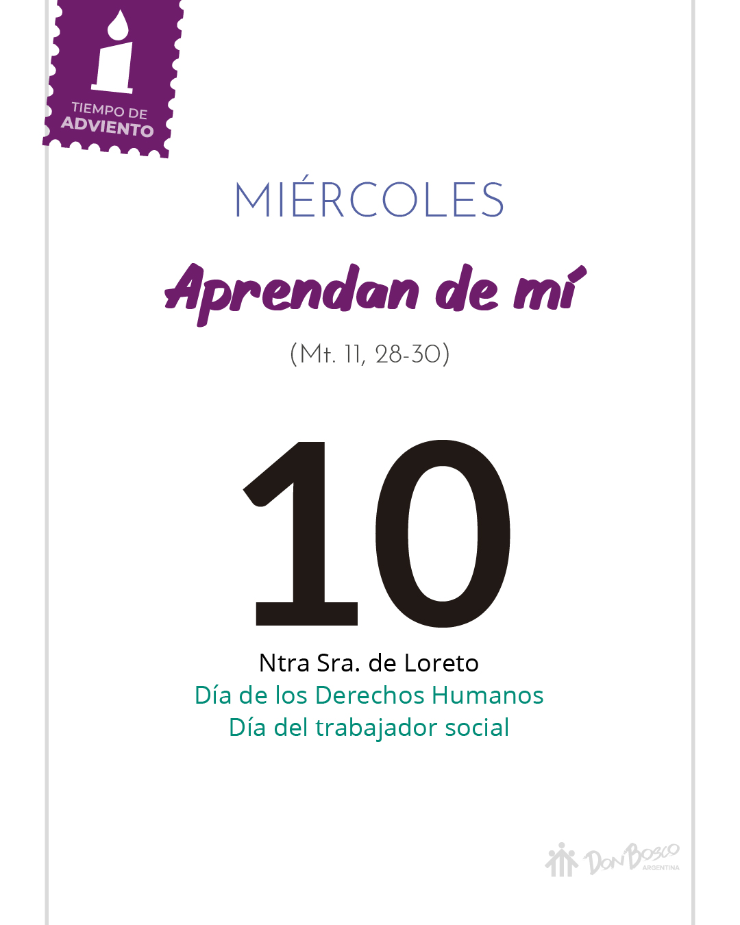"Vengan a mí los afligidos y agobiados, y yo los aliviaré". Una linda frase que me lleva a moverme, a seguir peleando, a no quedarme en el llanto, en la angustia: a ir a Él. Hubiera sido más fácil que diga "esperen los afligidos y agobiados que yo los aliviaré" pero no hubiera salido de Jesús. No. Jesús me llama a caminar, a afrontar las cosas, pero siempre poniéndolo a Él como meta, ya que ahí está mi alivio. Sus gestos y su palabra son mi alivio, porque son sacramento de Dios, evocan a Dios y expresan el Amor más grande y verdadero de todos. Me acuerdo de la gente y de los pibes que también quiero llevar a Jesús. "...Aprendan de mí...": ¿Qué tengo que aprender de Jesús? Reviso mi interior, mis deseos, mis proyectos, mis búsquedas para ver cuándo busco crecer en el interior y cuándo en el exterior. "Soy paciente y humilde de corazón": Otra palabra del Maestro que me exhorta y me deja pensando. ¿Cuánto soy yo "de corazón?