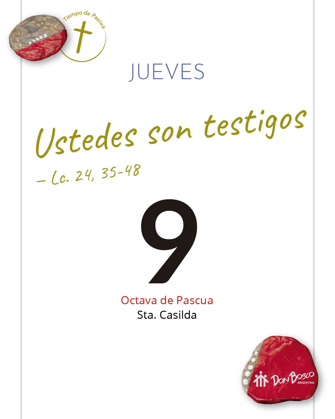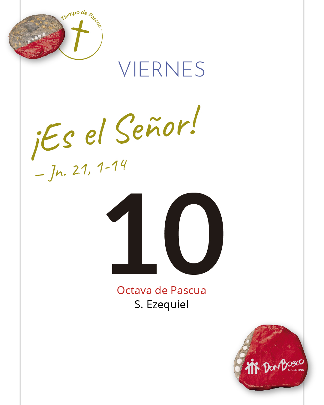Pedro vuelve a su centro, tras las negaciones, puede escuchar a Juan y confía porque Jesús confía en él. Juan reconoce a Jesús desde lo cotidiano. Cuando se cumple la promesa de que iban a pescar, como antes, se revela ante él Aquel a quien tanto amaba. En los gestos cotidianos, en los milagros de cada día, Jesús aparece resucitado. Jesús prepara el alimento y los espera. Así nos espera en cada Eucaristía. En ese gesto amoroso de esperarnos a comer vivimos su presencia, pero también en el hecho de que nos invite a aportar nuestro pez. Es con nuestro trabajo sencillo y cotidiano que construimos el Reino. El encuentro se plenifica, se hace fiesta, en la fracción del pan. En ese compartir con Jesús, sentimos que se renueva nuestro llamado, nuestra vocación, dejamos de tener miedo, confiamos en que la pesca será abundante. Al creer en la resurrección ya no necesitamos decir “¿quién eres?”, lo sabemos.