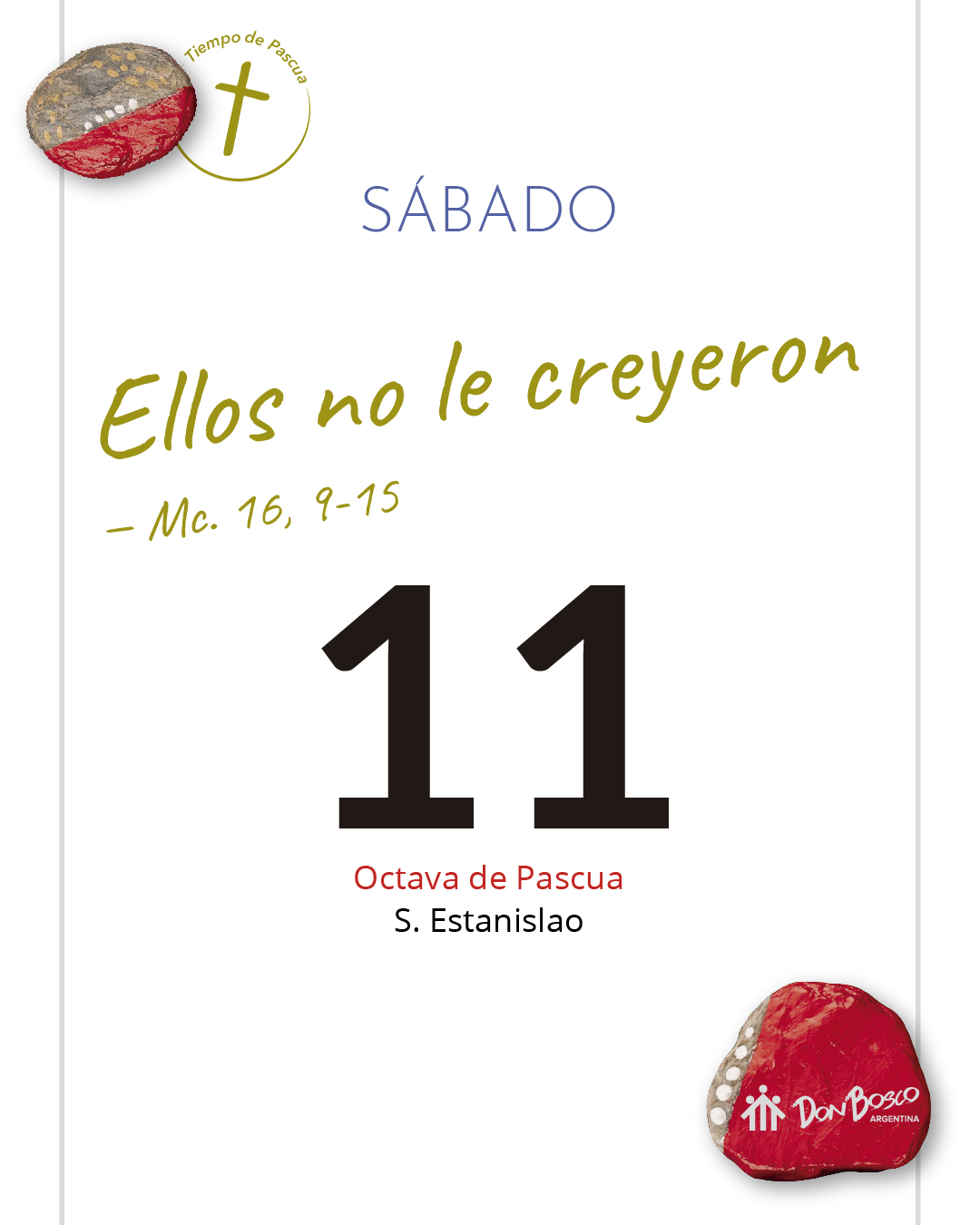 “… se apareció primero a María Magdalena”. Debe provocarnos esta actitud de Jesús. Mujer y (ex)endemoniada, primera testigo de su resurrección. Debemos cuestionarnos por qué todavía seguimos construyendo o manteniendo estructuras machistas a pesar de la certeza del rol fundamental de la mujer en la historia de salvación (busquemos en el antiguo testamento, en la genealogía de Jesús, en la Virgen María, en Marta y María y tantas otras). “… no le creyeron… pero tampoco les creyeron”. Veo en estas frases una interpelación a mi falta de Fe, a mi siempre estar esperando una confirmación más. A mis negativas de navegar mar adentro, con la certeza de lo incierto. “Vayan por todo el mundo, anuncien la Buena Noticia a toda la creación”. Me siento implicado en este mandato, y agradezco la confianza de Jesús depositada en mí para tamaña misión. “¡Ay de mí si no predico el Evangelio!”
