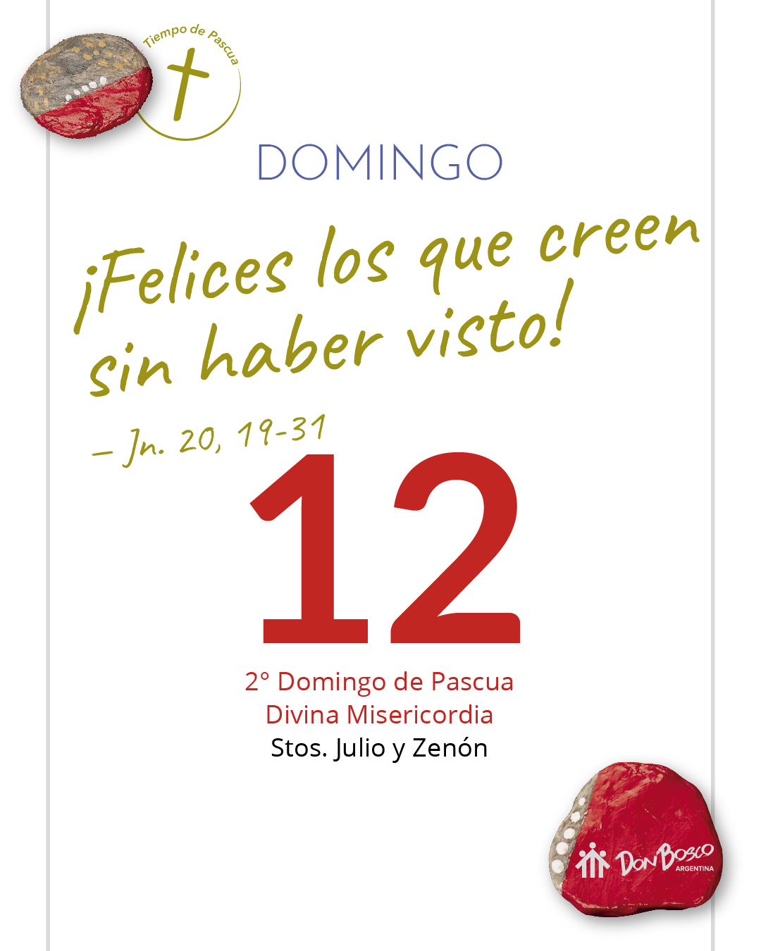 Jn. 20, 19-31 Al atardecer de ese mismo día, el primero de la semana, estando cerradas las puertas del lugar donde se encontraban los discípulos, por temor a los judíos, llegó Jesús y poniéndose en medio de ellos, les dijo: «¡La paz esté con ustedes!». Mientras decía esto, les mostró sus manos y su costado. Los discípulos se llenaron de alegría cuando vieron al Señor. Jesús les dijo de nuevo: «¡La paz esté con ustedes! Como el Padre me envió a mí, yo también los envío a ustedes». Al decirles esto, sopló sobre ellos y añadió: «Reciban el Espíritu Santo. Los pecados serán perdonados a los que ustedes se los perdonen, y serán retenidos a los que ustedes se los retengan». Tomás, uno de los Doce, de sobrenombre el Mellizo, no estaba con ellos cuando llegó Jesús. Los otros discípulos le dijeron: «¡Hemos visto al Señor!». Él les respondió: «Si no veo la marca de los clavos en sus manos, si no pongo el dedo en el lugar de los clavos y la mano en su costado, no lo creeré». Ocho días más tarde, estaban de nuevo los discípulos reunidos en la casa, y estaba con ellos Tomás. Entonces apareció Jesús, estando cerradas las puertas, se puso en medio de ellos y les dijo: «¡La paz esté con ustedes!». Luego dijo a Tomás: «Trae aquí tu dedo: aquí están mis manos. Acerca tu mano: métela en mi costado. En adelante no seas incrédulo, sino hombre de fe». Tomás respondió: «¡Señor mío y Dios mío!». Jesús le dijo: «Ahora crees, porque me has visto. ¡Felices los que creen sin haber visto!». Jesús realizó además muchos otros signos en presencia de sus discípulos, que no se encuentran relatados en este Libro. Estos han sido escritos para que ustedes crean que Jesús es el Mesías, el Hijo de Dios, y creyendo, tengan Vida en su Nombre. |