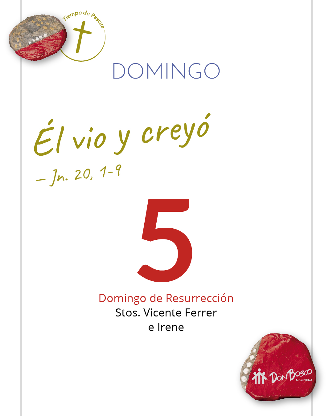 Mirando el texto, vemos que hay un dinamismo de lo personal a lo comunitario, de la duda a la fe. Vemos un camino, que indica búsqueda, venciendo resistencias y oscuridades. Vemos que una mujer toma la iniciativa, y es la que pone en camino a la comunidad. Vemos que se corre juntos, si bien cada uno a su ritmo. No escuchamos un anuncio explícito, con palabras. Aquí el anuncio es el testimonio de María, y el entrar y ver, de los discípulos. El anuncio es entrar en la experiencia, que moviliza a toda la persona de los discípulos. Sin salir, correr, dejarse movilizar por la fe de los hermanos no hay experiencia de encuentro que permite comprender el proyecto de vida nueva ofrecida en Jesucristo. Es clara la elección, de Pedro y el otro discípulo que, que sos vos, que soy yo, de escuchar a María, y salir juntos, a vivir la experiencia de entrar en la luz de la resurrección. ¿Cuáles son nuestras elecciones, frente a propuestas de caminos nuevos para anunciar y vivir la fe? En cada uno podemos decir, existe una María, una fe inquieta, madrugadora, con corazón amante. También está Pedro, podemos decir el que tiene las llaves, la autoridad, la institución. Y no falta el otro discípulo, el amado, el que apoya su cabeza en el costado del maestro. El corazón que ama, tantas veces, llega primero, pero solo existe experiencia plena de resurrección, si los dos entran juntos en esa fuerte experiencia de fe, que permite iluminar el camino de la Iglesia. El actuar los vemos en ese proceso de correr juntos, María, Pedro y el otro discípulo. Es la invitación a actuar como comunidad, aceptando y valorando el ritmo de cada uno en el proceso de entrar, ver y creer. ¿Busco vivir la fe, abierto a la novedad del Resucitado, que nos deja claros signos de su victoria sobre las tinieblas de muerte? En mi actuar me dejo movilizar, desinstalar de mis propias ideas y seguridades. ¿Soy capaz de correr y esperar a los hermanos para entrar juntos en la profunda experiencia de Resurrección?