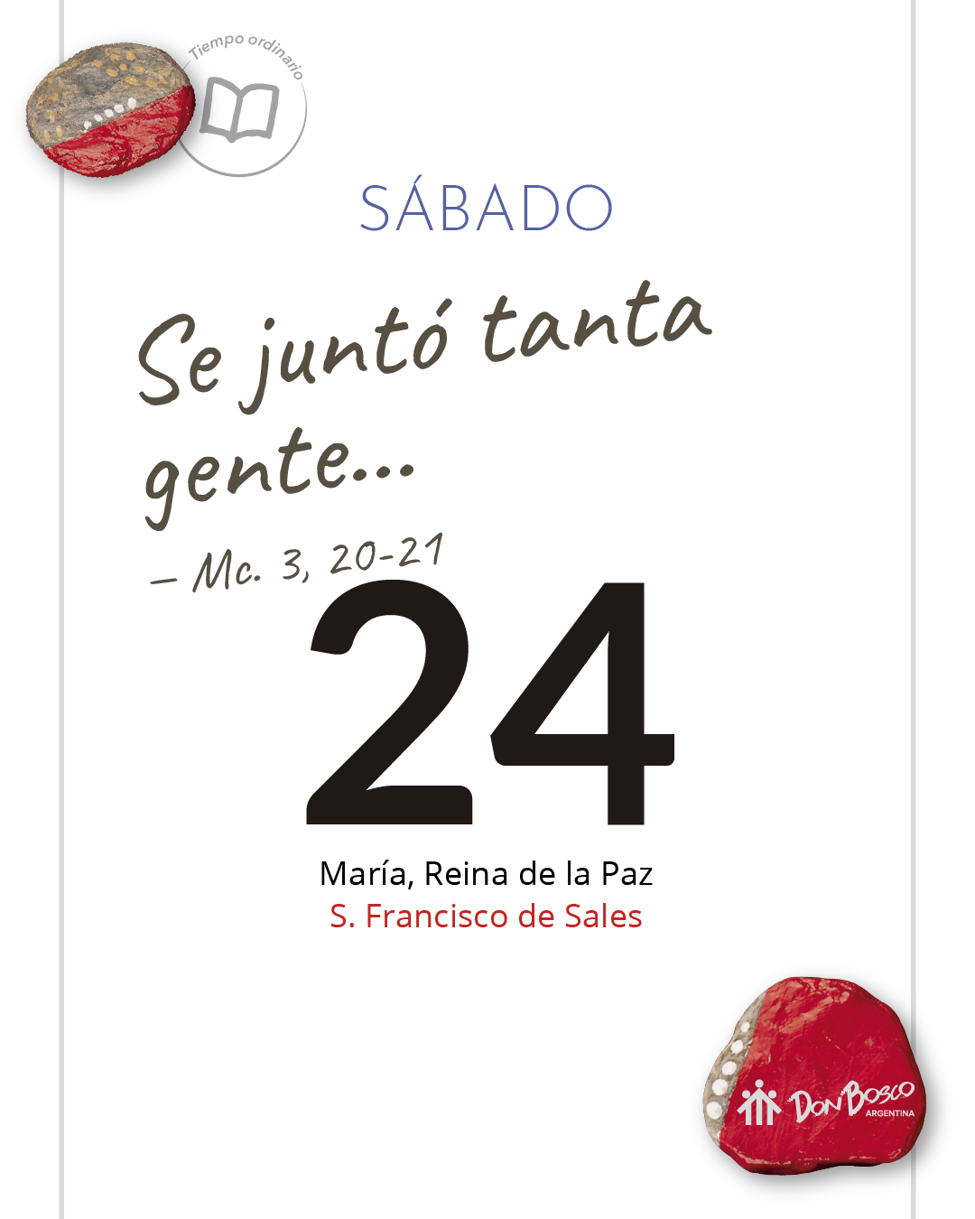Pienso en la ardua misión, pienso en los tiempos que Jesús le dedica a la gente. Pienso que cuando algo nos apasiona no medimos tiempos ni horarios… se pasa y no nos damos cuenta, pasa volando. Y pienso que a veces no tenemos tiempo para lo indispensable. Podemos pensar en la comida, o en tiempos personales, familiares, con amigos… eso si no están incluidos dentro de la actividad o el trabajo que nos apasiona. Jesús vivía su causa y su misión con quienes él eligió, su comunidad. ¿Cómo vivimos nosotros nuestras pasiones? ¿Con quiénes? ¿Le damos el tiempo suficiente a quienes nos rodean? ¿Cómo nos ven los demás? ¿Exaltados, exagerados, fuera de sí?