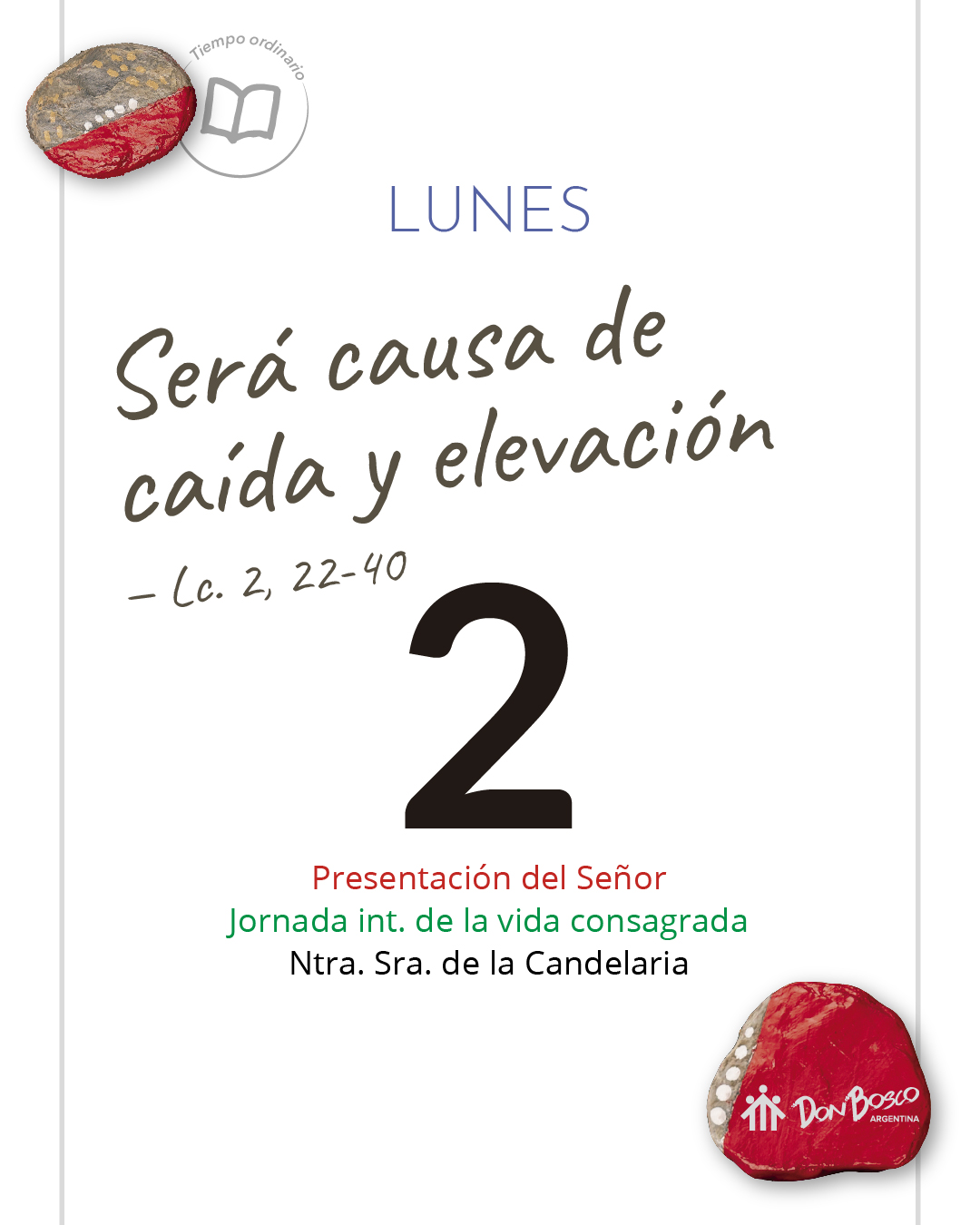 "El niño iba creciendo y se fortalecía". Miro a nuestros chicos y chicas, me asombro y me alegro de su crecimiento, los contemplo en Dios, me sitúo ante ellos interiormente con renovado respeto. "...para presentarlo al Señor". Considero cuántos chicos no son presentados a Dios y agradecidos, sino desechados, abandonados y vulnerados; reafirmo mi apuesta vital de cuidado y defensa de sus derechos. "Un hombre llamado Simeón... una profetisa llamada Ana". Identifico personas que profetizaron en nuestra vida y nos develaron la misión personal... Quizá hoy día, hermanos ancianos a veces sabios y profetas... "...para alumbrar a las naciones". La voluntad de Dios es incluir a todos y por eso repaso mis prácticas incluyentes/excluyentes... Detecto estilos de convocatoria más o menos abiertos... Visualizo mundos juveniles que actualmente quedan afuera de nuestra amistad y propuestas... Dejo que me resuenen palabras sugestivas: La Espada... la Luz que ilumina... El Signo de contradicción... El desnudarse los Pensamientos íntimos de muchos...