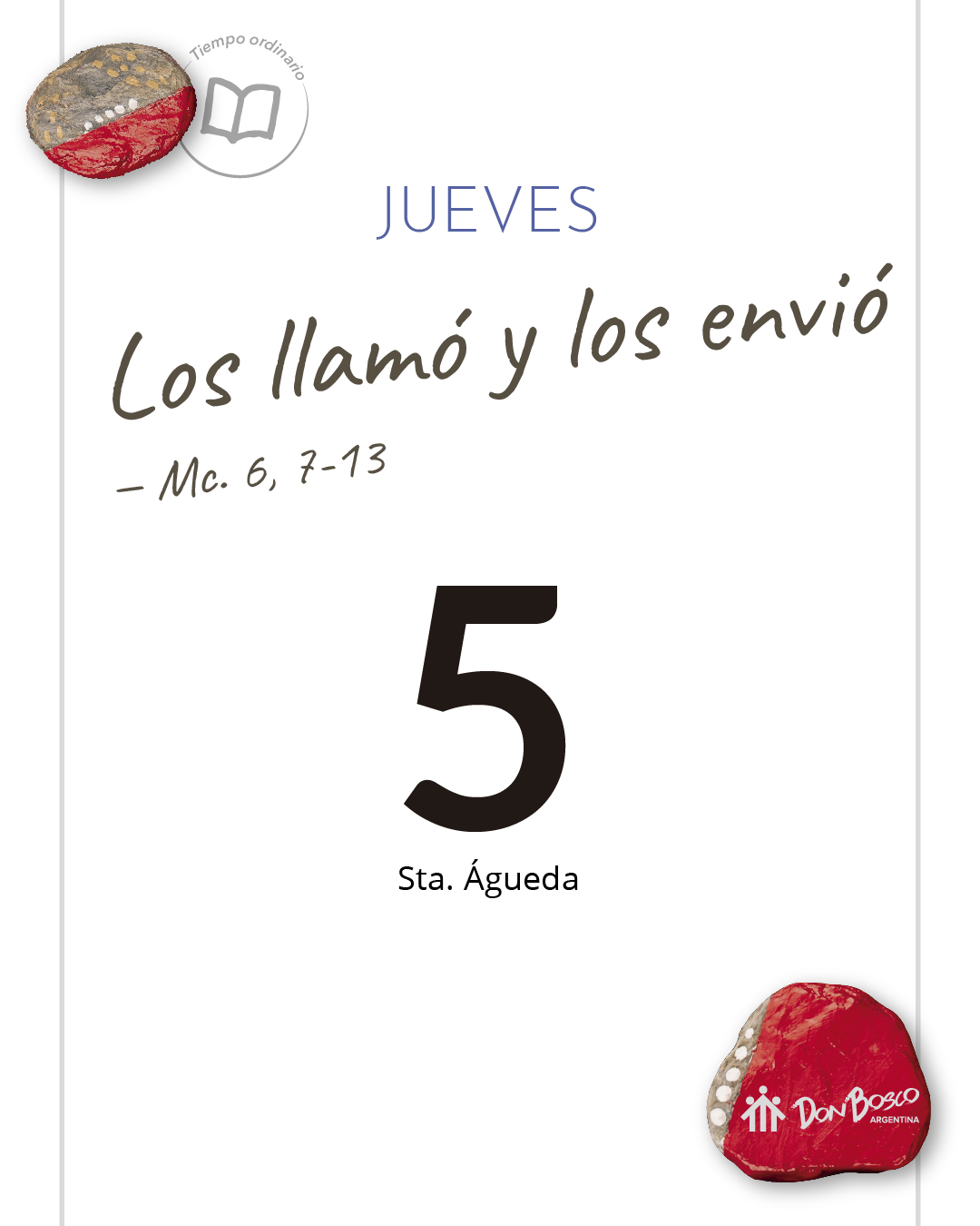 “Llamó… y los envió”. Sé que este texto habla de mí, discípulo y apóstol; me lo dejo decir varias veces. “Y les ordenó que”. Me confronto punto por punto con las instrucciones; me da la sensación de estar muy provisto para el viaje, ¿viajo con cosas de más? “Entonces fueron”. Reinterpreto mi vida como un viaje, como un envío misionero. Reinterpreto el día de hoy desde ese marco de comprensión del por qué hoy me levanté, por qué hoy trabajo, para qué hoy me encontraré con personas… “De dos en dos”. Sintonizo con los grupos de jóvenes que vibran tanto con esta invitación a ser una comunidad misionera. “Muchos… numerosos enfermos”. Visualizo mi territorios cotidianos de misión joven… retomo el ánimo para viajar por allí, hay muchos esperando.