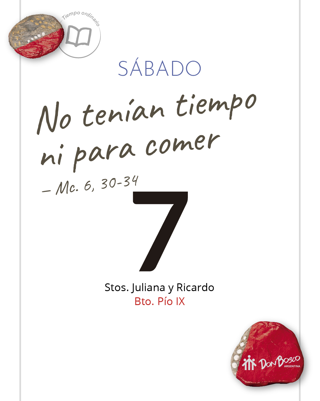 “Vengan ustedes solos a un lugar desierto”. El descanso apostólico en el lugar desierto; Jesús me invita a que el descanso sea parte sagrada (vivida con Él y en Él) de mis rutinas de misionero. Cuidarme de la omnipotencia de quien “es más que Dios” porque cree que nunca necesita descansar. Cuidarme de exigir eso a otros… y nunca invitarlos a descansar. “Entonces se fueron solos en la barca a un lugar desierto”. La intimidad de ese viaje en la barca, la dimensión contemplativa y de intimidad con el Señor, es parte de mi dinámica de plena entrega. ¿La cultivo? ¿En qué horarios y agenda se manifiesta tal soledad con el Señor? “No tenían tiempo ni para comer”. El tiempo “para comer” de los apóstoles… qué tema de meditación, nuestros trastornos alimenticios, por excesos o defectos, desde el “sobregratificarnos” al desatendernos; a veces la inhumanidad de la falta de mesa familiar con conversación que recrea y vinculación servicial y cariñosa. La desproporción entre demandas y posibilidades, ¿cómo la gestionamos? “Se compadeció de la multitud porque eran como ovejas sin pastor”. La figura del Pastor que se compadece… Somos objeto y testigos de la compasión de Dios… Y por eso nos compadecemos de la gente, y nos duele ver tantos jóvenes sin espacios ni propuestas, y tal compasión nos mueve…