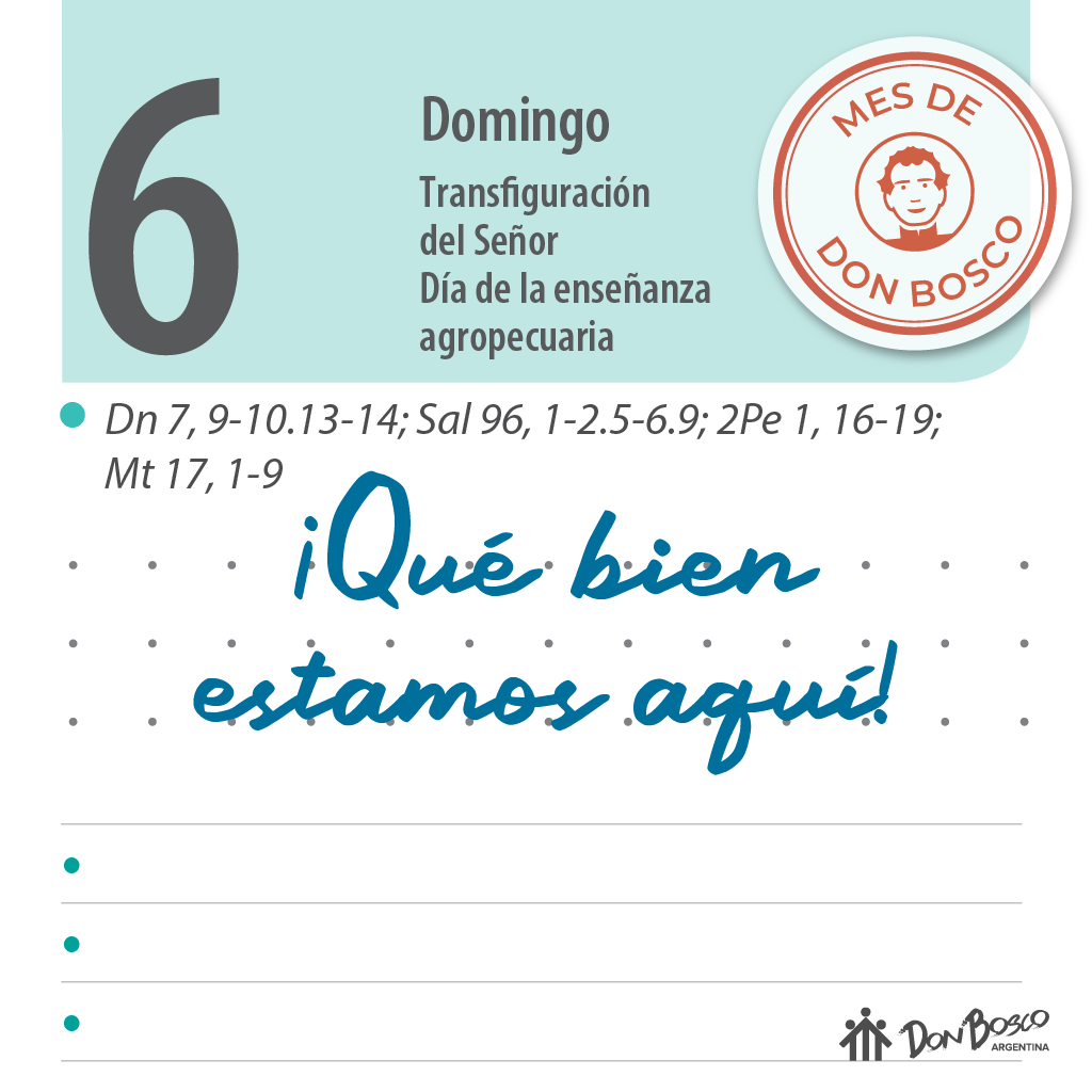 Mt 17, 1-9 Seis días después, Jesús tomó a Pedro, a Santiago y a su hermano Juan, y los llevó aparte a un monte elevado. Allí se transfiguró en presencia de ellos: su rostro resplandecía como el sol y sus vestiduras se volvieron blancas como la luz. De pronto se les aparecieron Moisés y Elías, hablando con Jesús. Pedro dijo a Jesús: «Señor, ¡qué bien estamos aquí! Si quieres, levantaré aquí mismo tres carpas, una para ti, otra para Moisés y otra para Elías». Todavía estaba hablando, cuando una nube luminosa los cubrió con su sombra y se oyó una voz que decía desde la nube: «Este es mi Hijo muy querido, en quien tengo puesta mi predilección: escúchenlo». Al oír esto, los discípulos cayeron con el rostro en tierra, llenos de temor. Jesús se acercó a ellos y, tocándolos, les dijo: «Levántense, no tengan miedo». Cuando alzaron los ojos, no vieron a nadie más que a Jesús solo. Mientras bajaban del monte, Jesús les ordenó: «No hablen a nadie de esta visión, hasta que el Hijo del hombre resucite de entre los muertos». |